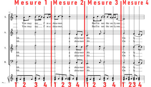 Essayez de dire les syllabes de votre partition (Sopran, Alto, Ténor, Basse) en rythme